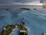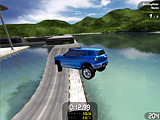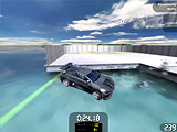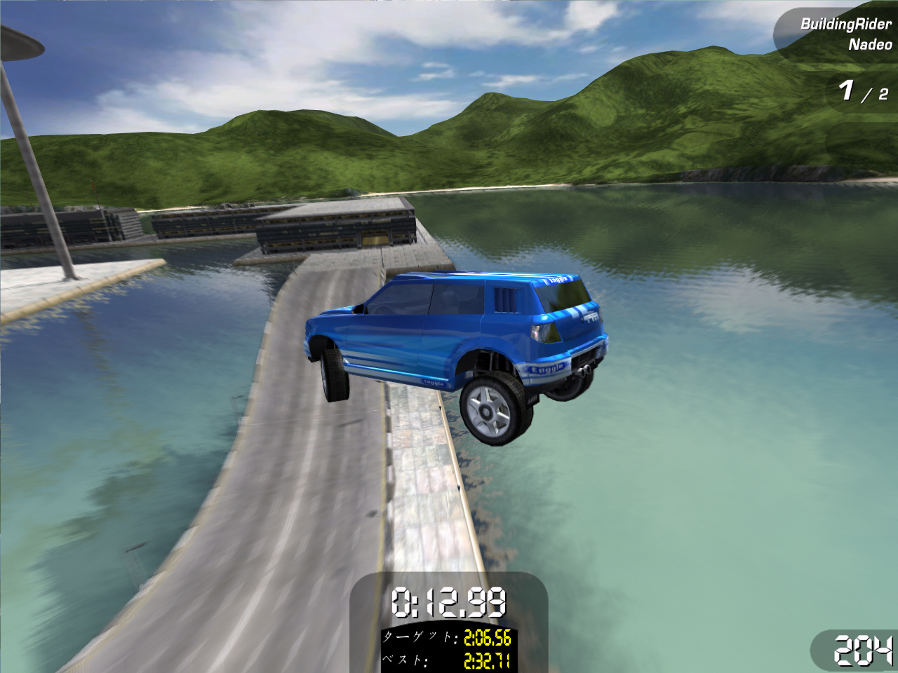 | 真正面の水上にある細いコースが行くべき場所。どんなに頑張ってもジャンプでは届かない。実はとんでもない方法でコースへ復帰するのだ | 制限時間内に派手なアクションを決めてポイントを稼ぐスタントモード。ジャンプの瞬間にハンドルを切って空中で回転させる | 用意されたアイテムを配置して,スタートからゴールまでのコースを組み立てるパズルモード。最短距離で走れるコースを作れ |