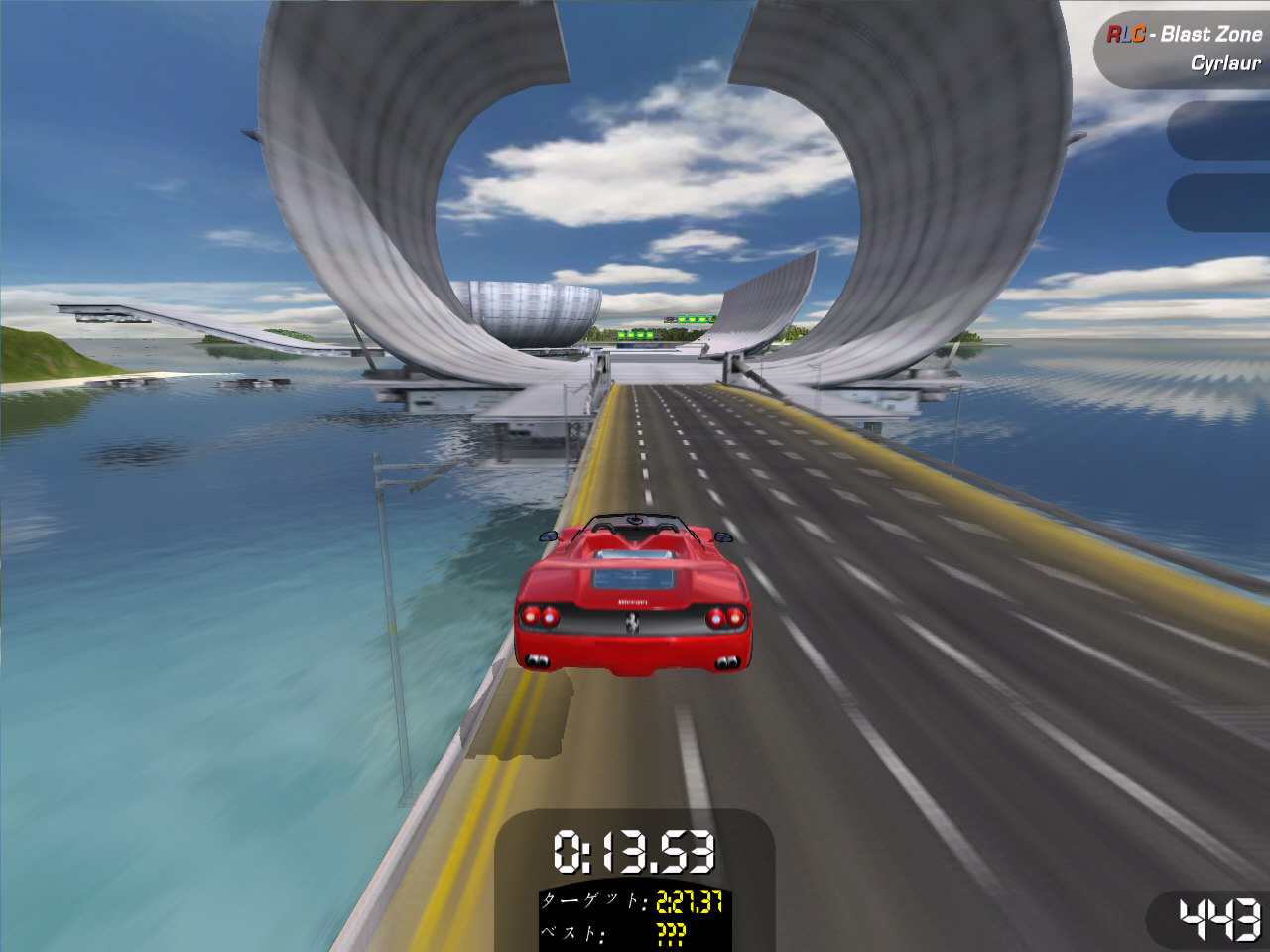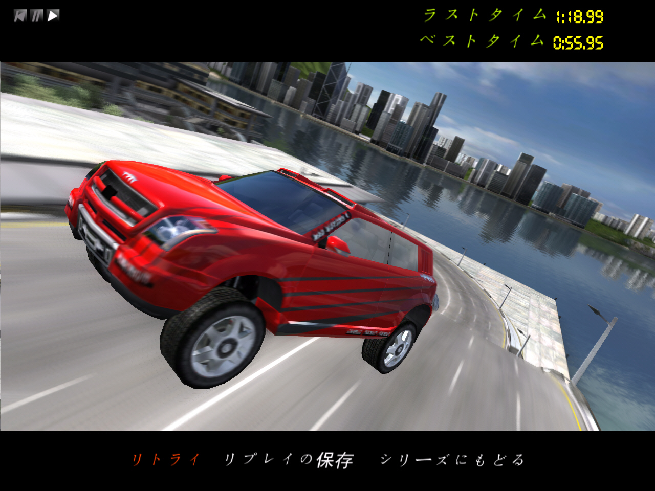 そんなわけで,さっそくレースだ。ゲームに登場するトラックは,いずれもほかのカーゲームでは決して登場しないであろう突拍子もないものばかりだ。淡々と平坦な道路を走るのとはわけが違い,おい,無理だろこれ! と思える派手な,というか無茶な,場合によっては非常識なトラックを攻められるのが本作の醍醐味だ。それぞれのトラックは,いずれも“豪快に行くべきところと慎重に行くべきところのバランス”がお見事で,何度トライ&コースアウトを繰り返してもふたたび挑戦したくなってくる。車にはとくにモデルがあるわけではないが,ぶつけても転がっても海に落ちても全然平気なので,せいぜい盛大にやっていただきたい。