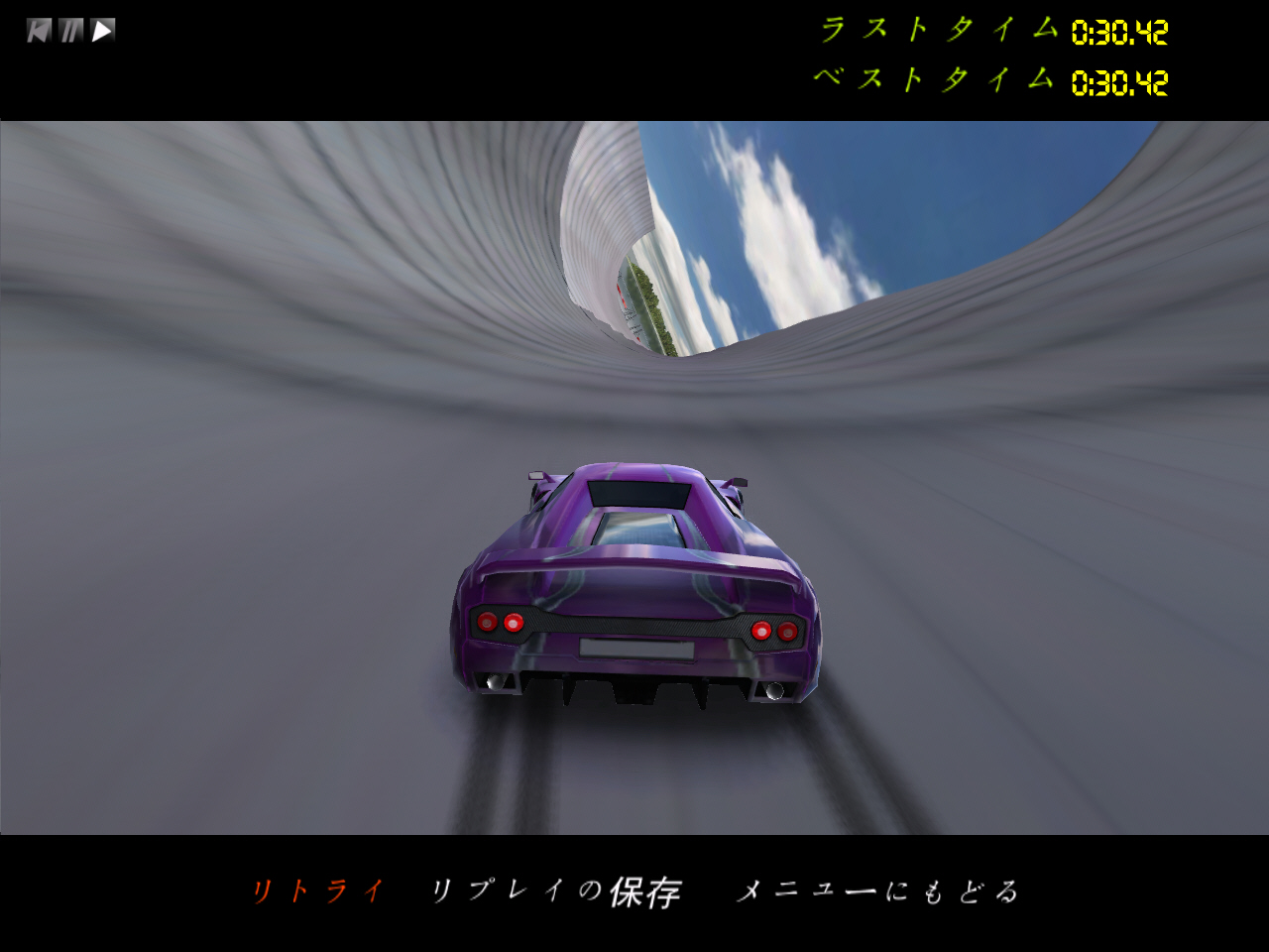 とはいえ,ちょっと気になったのがプレイ視点の強制切り替え。ゲームには,二つの後方視点とバンパー視点が用意されているのだが,後方視点でプレイしていてもジャンプ台やループに入ると強制的にバンパー視点に切り替えられてしまうのだ。方向が分からずに斜めに飛び出したり,ループ中,あらぬ方向へ進んでしまうことがしばしばあった。