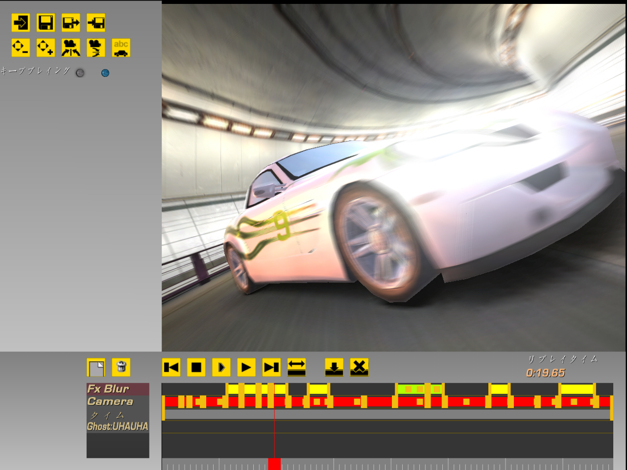だが,リプレイエディターを使って保存してある自分のリプレイデータを読み込み,ビデオ編集でお馴染みのタイムライン上にカメラアングルやモーションブラーのエフェクトなどを配置すれば,なんと,オリジナルのリプレイ映像を作れてしまうのだ。AVI形式でファイル出力できるので,レース映画のようなカッコ良いリプレイムービーを作って一人でニヤニヤきるのはなにより嬉しい。