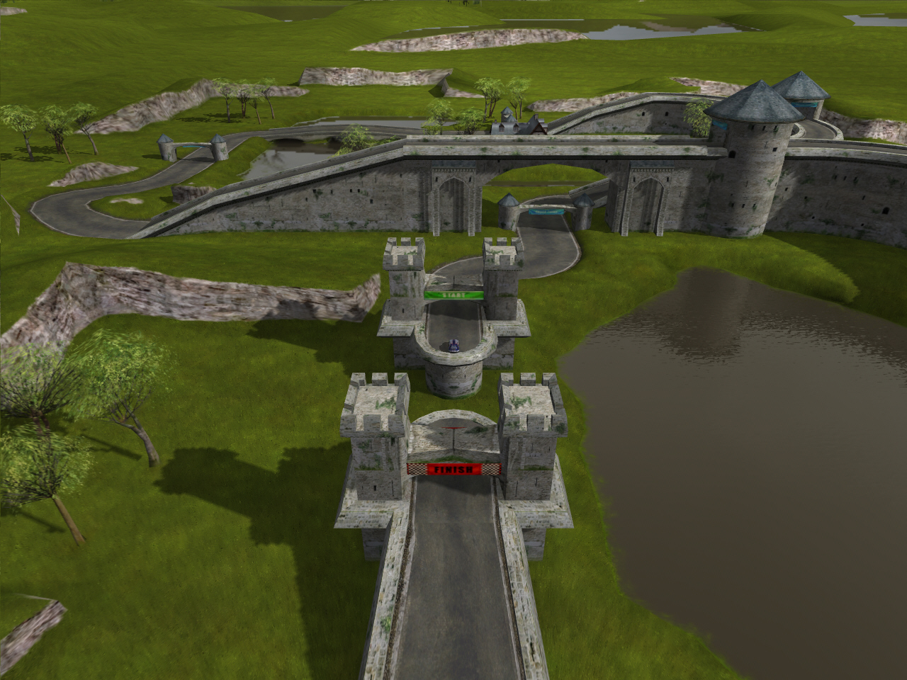 ヨーロッパの片田舎に作られたような「ラリーステージ」では,サーキットを思わせるロードコース,湖(沼?)の畔や民家の軒先を走り抜けるグラベルコース,コースがあってないような草原,どういうつもりか城壁の上など,移り変わる路面状況にいかに対応できるかがポイントだ。