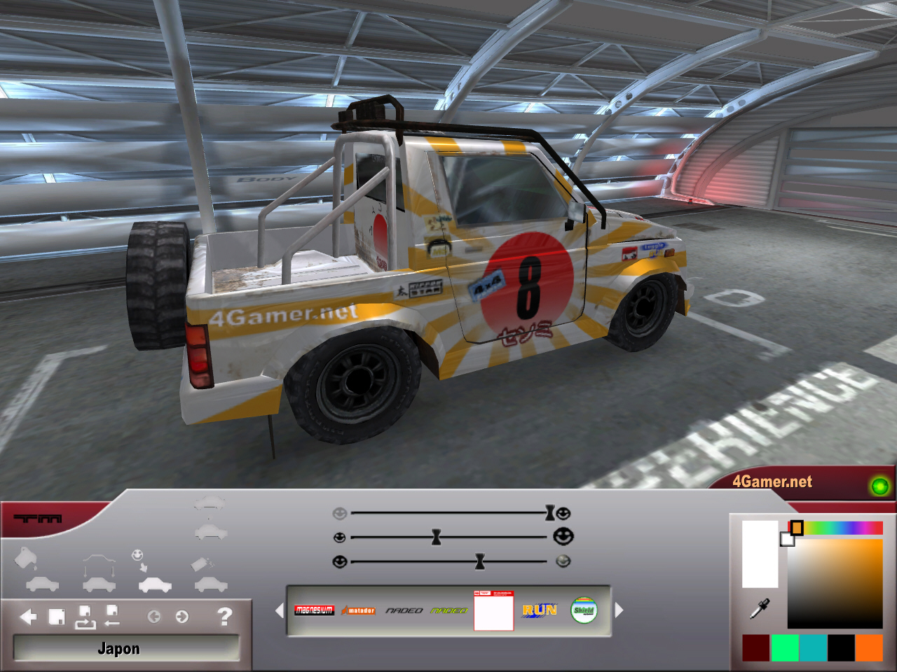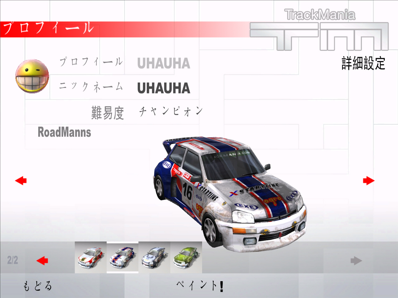 | コンパクトなレイアウトのTMOのコースは,コンパクトゆえのトリッキーなレイアウトが随所に見受けられる | スキンエディタで,車のボディ色やテクスチャ変更,文字追加などが可能。あまり高機能ではないので期待せぬように | プロフィールで,難度を「見習い」「プロ」「チャンピオン」に設定可能。登場する車のカラーもここで変更する |