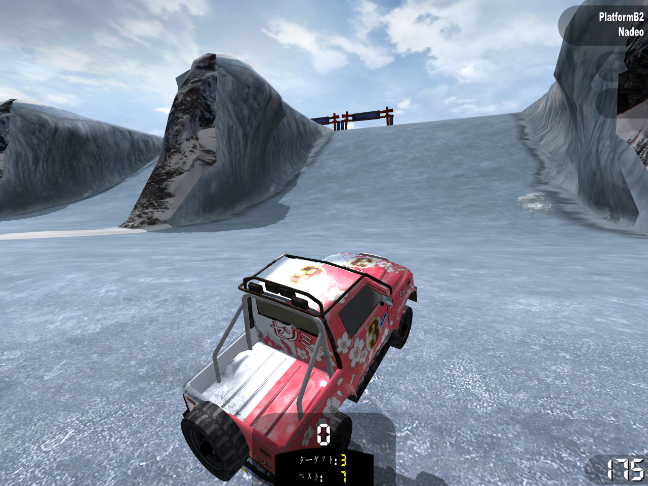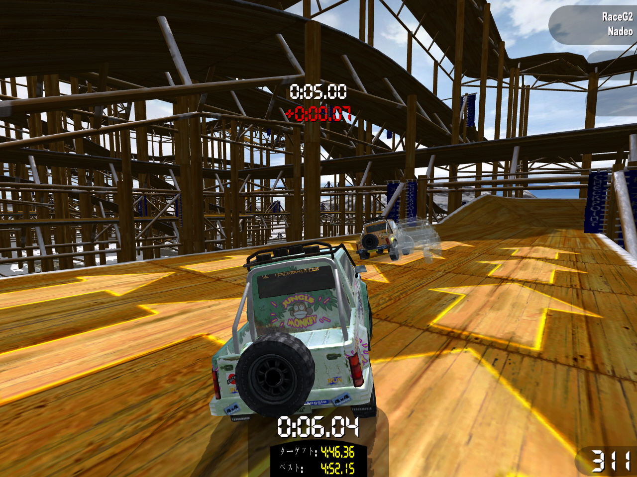 このステージで使う車は,意味不明なカタカナロゴが書かれたピックアップトラック。タイヤのグリップ力が高く,狭いコースをハイスピードで走り回れるのが気持ちいい。