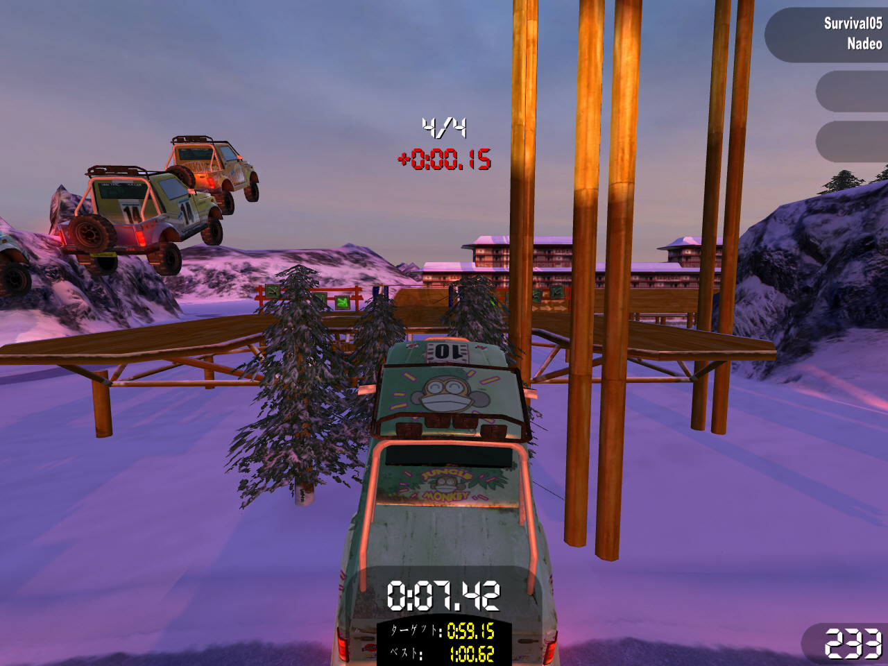 | 「サバイバル」チャレンジは,ランダムに選択された二つのコースのどちらかを走る。苦手なコースは避けていこう | 各チャレンジにターゲットタイム,ポイントが決められており,成績によりメダルが獲得できる。良い成績を目指せ | 一度走ったことのあるコースは,「シングルチャレンジ」モードで自由に走れるようになる。コースを制覇しよう |