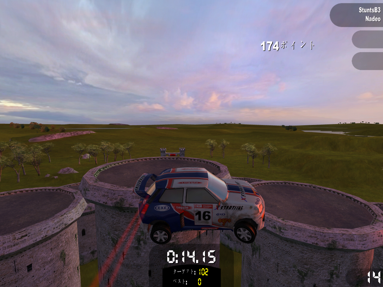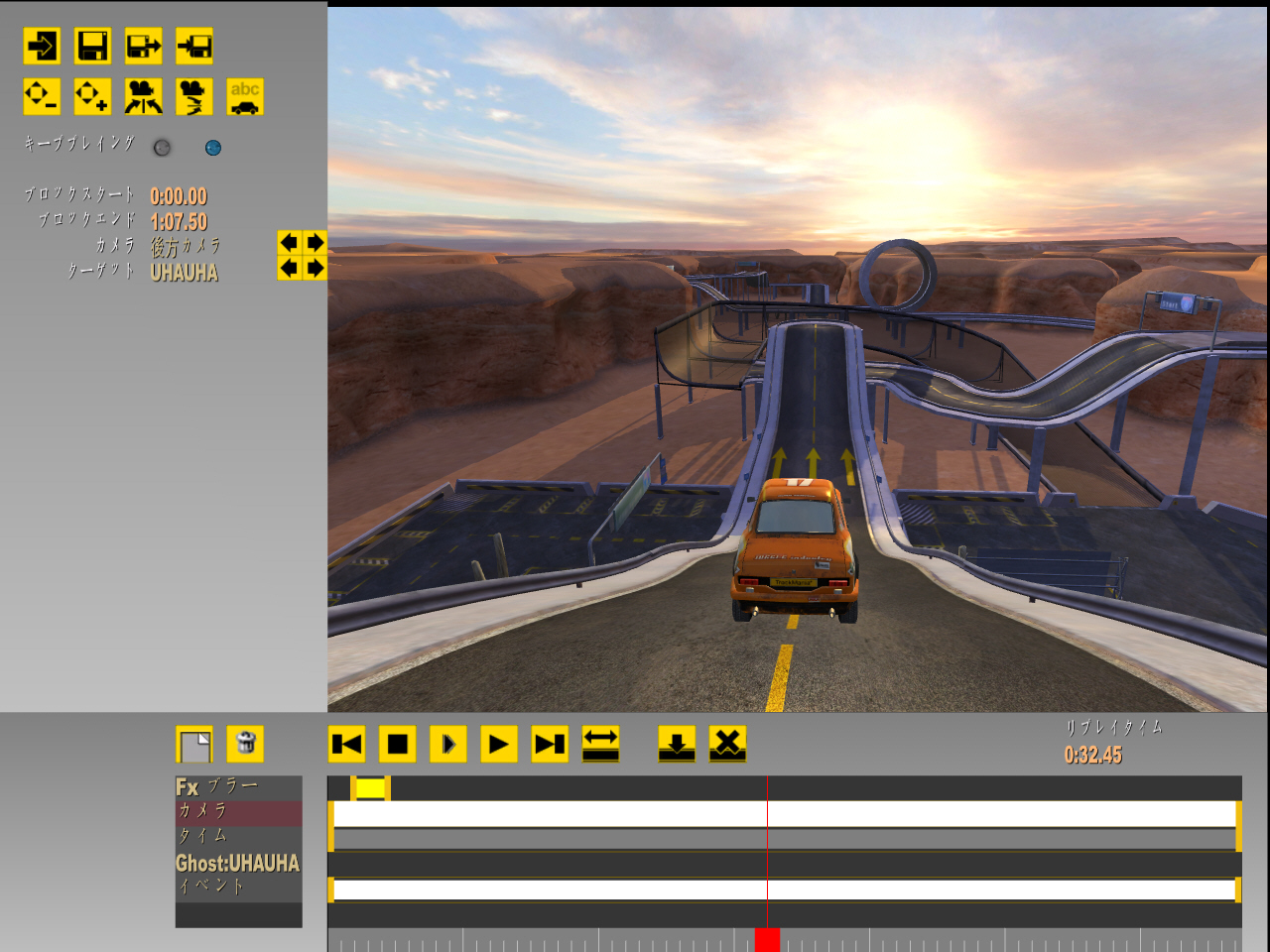 | 朝,昼,夕方の時間帯はコースにより固定されている。夕方は幻想的で美しいが,コースが見えにくくて難度は高い | オフィシャルコース顔負けのイカれたコースを作れるトラックエディタ。建設ブロックを繋ぎ合わせていくだけと簡単 | リプレイエディタでリプレイのカメラアングル変更,ブラー効果追加などオリジナルリプレイを作れる。ただし難しい |