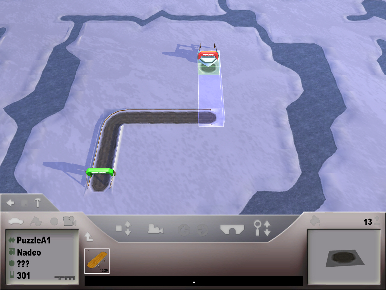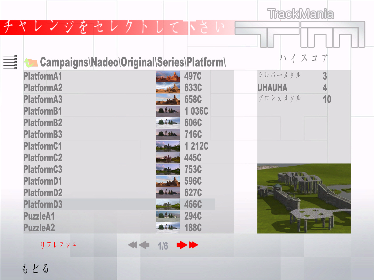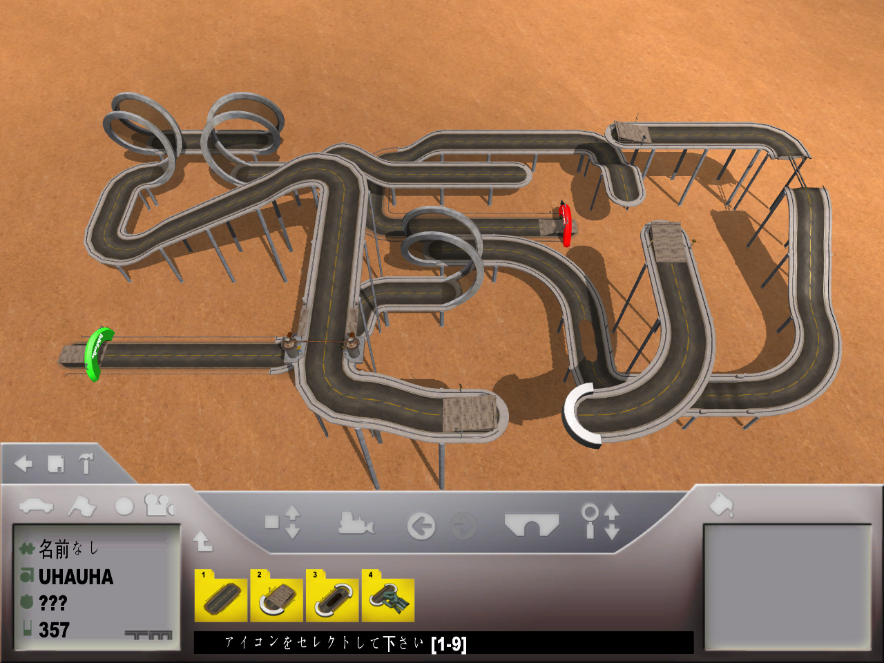 オフィシャルチャレンジで,チャレンジをターゲットタイム内でクリアすると,成績によって「ブロンズ」「シルバー」「ゴールド」のメダルを授与され,カパーが加算されていく(初期値は1500カパー)。つまり,カパーが多いほどゴージャス(?)なオリジナルコースが作れるというわけだ。よって,トラックエディタでも遊ぶつもりなら,多くのチャレンジを好成績でクリアしておくことが重要になる。とはいえ,少ない建設ブロックでも面白いコースは作れるので,結局はセンスの問題だろう。