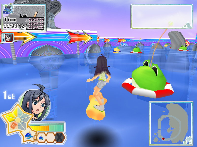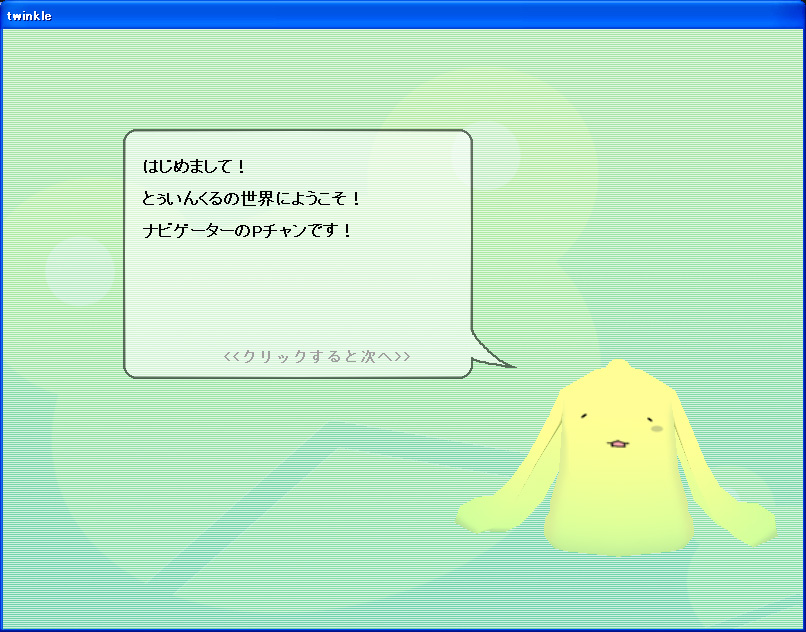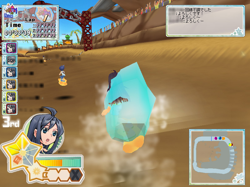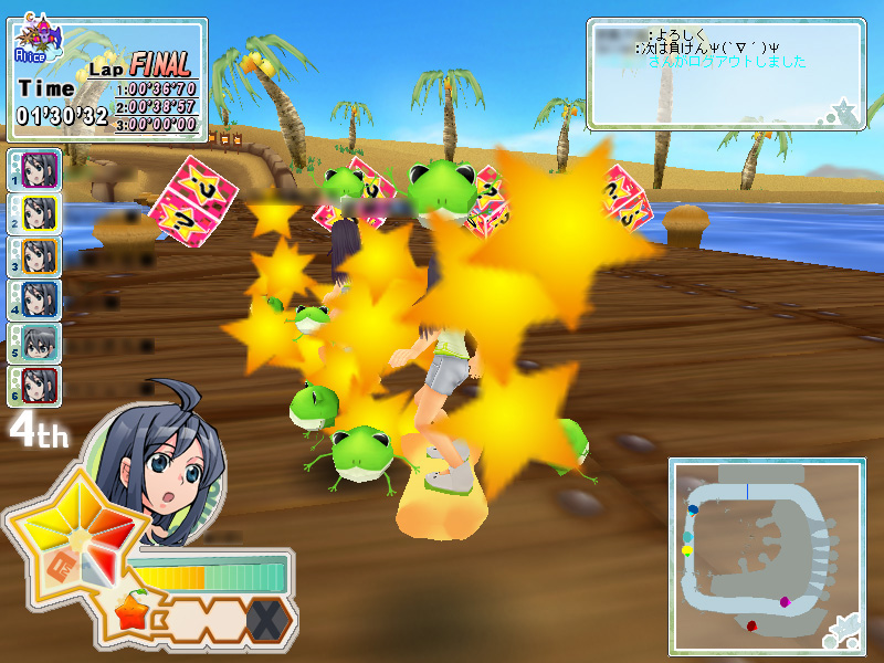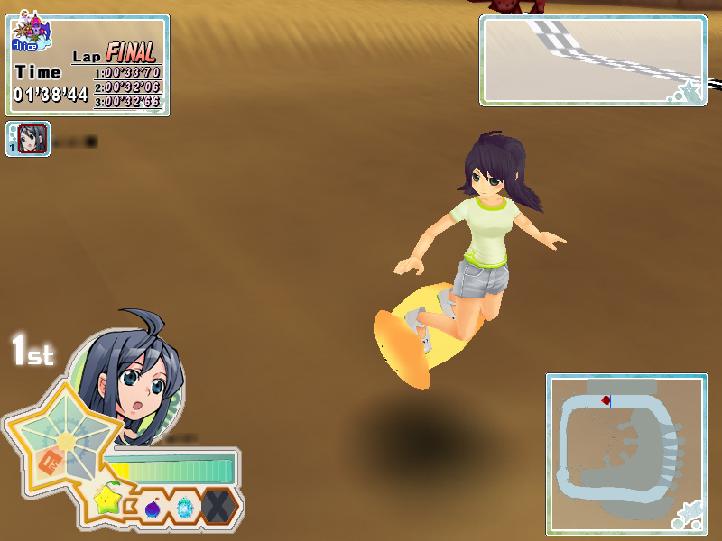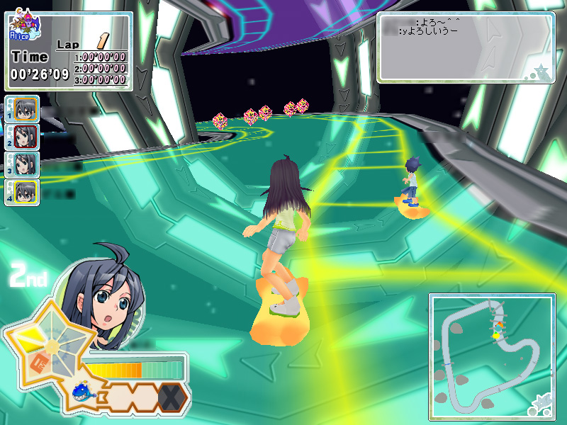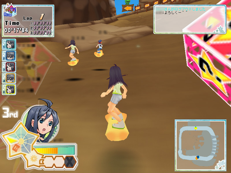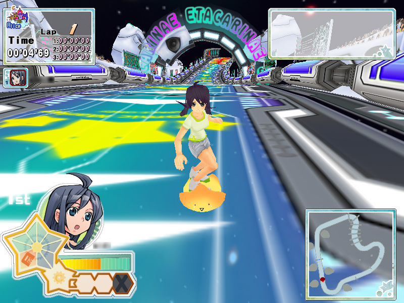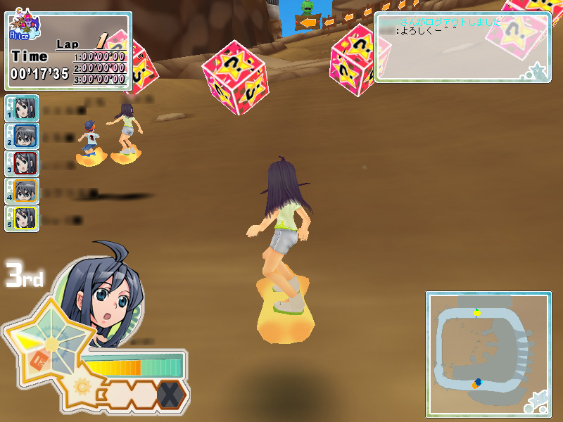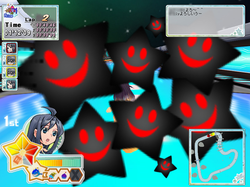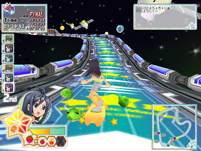 なお,細かなテクニックとして一時的にとぅいんくる(星形の生物。プレイヤーたちはこの生物の背中にスケボーのように乗り,その状態でレースを行う)の走行速度がアップするダッシュや,ジャンプしながら方向が変えられる空中ターンも用意されているが,現在の仕様,および実装済みのコースでは,これらを駆使しなくても1位になることはできた。