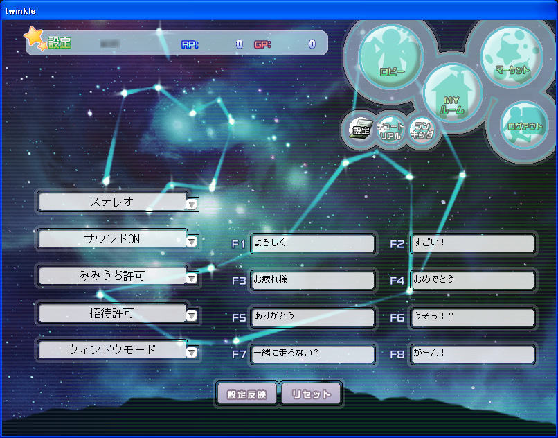 | 初めてゲームをプレイする前には,Pチャンによるチュートリアルを見ておこう。操作方法が一通り分かる | ゲームに関する各種設定や,ショートカットキーで送信できるメッセージなどは,「設定」画面で変更可能 | こちらがロビー画面。現在作成されているルームが,ズラリとリストで表示される。ソートも可能だ |