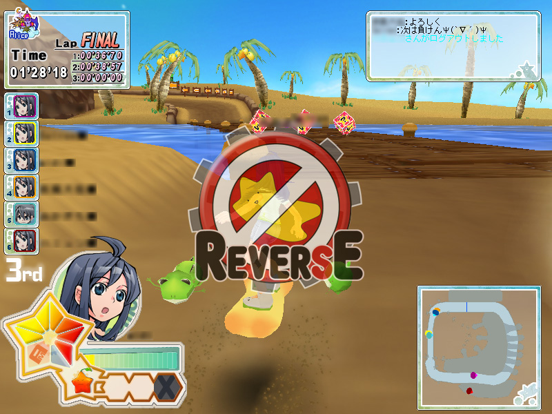 取ろうと思っていたアイテムボックスが,前を走るプレイヤーに取られてしまった。ギャフン! | 障害物に激突したとき,うまくリカバーしないとそのままバランスを崩し,逆走してしまうことも | 走れど走れど先頭を走るプレイヤーは見えず。それでも,最後まで奇跡と逆転を信じて走り続けろ! |