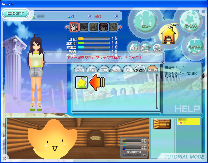 本作では,レース以外に育成と着せ替え要素も用意されている。プレイヤーの部屋にあたる「Myルーム」では,自分のとぅいんくるにアイテム(キノーミ)をエサとして与えることができる。エサをあげ続けるととぅいんくるは成長し(レベルアップ),スピードなどの各種パラメータが上昇する。