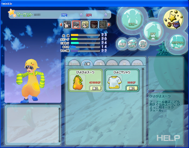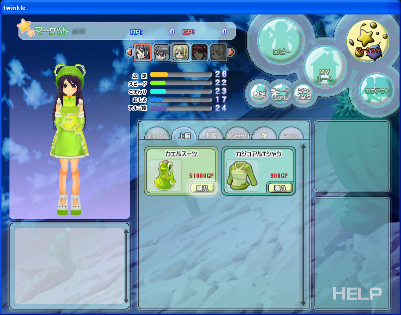 | レース前のルーム画面では,どのキャラ,どのとぅいんくるを使ってレースに参加するかが決められる | モモカといえばカエル。しかしこのカエルスーツ,5万1000GPとかなり高めの価格設定。買える? なんちて | ひよっこといえばひよこ,ひよこといえ(以下略)。性能が大幅に上昇する服なので,こちらも高価 |