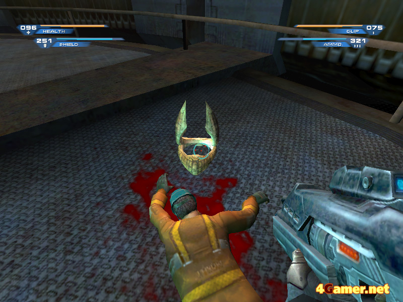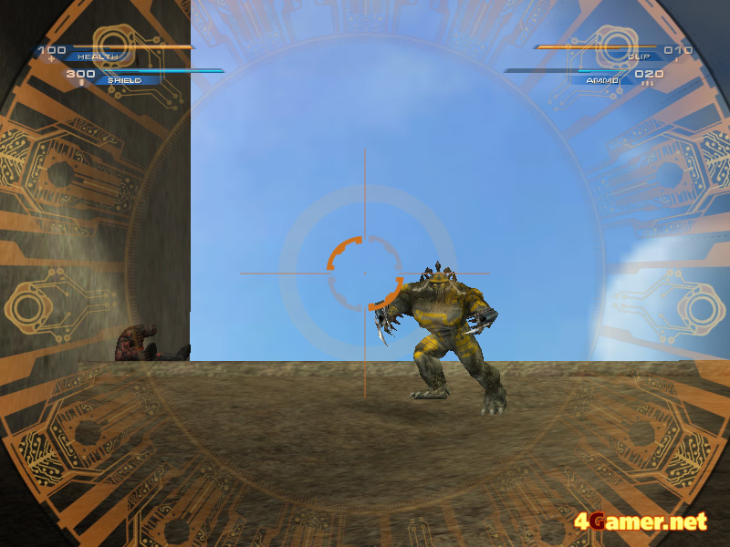 | 旧敵Skaarj。近くまで来るとエネルギー弾を連射してきてあまり本体が見えないので,遠距離からスナイパーライフルのスコープで覗いて撮影した。相変わらず,やる気満々の異星人だ |