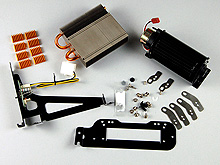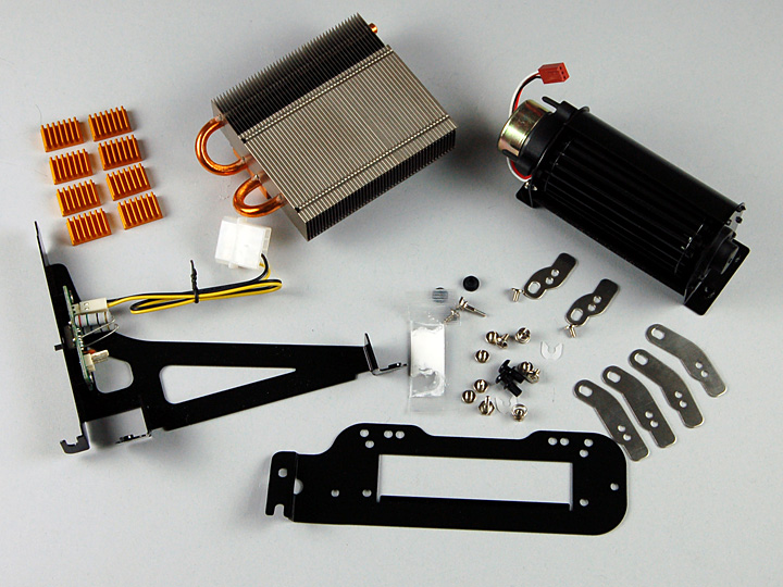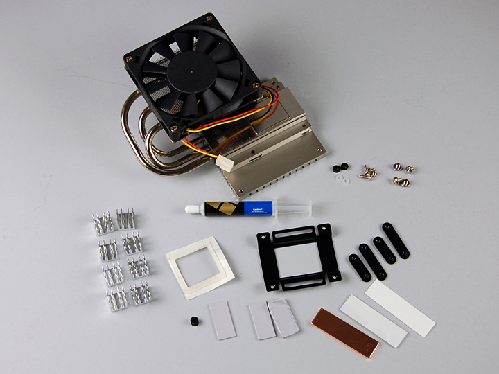 V1 ULTRAは,GPU側に大きなヒートシンクを配し,3本のヒートパイプでカード裏面側の放熱フィンへ熱を送るという仕組みだ(右上)。対応するGPUが多いのは魅力なのだが,その分部品点数は多く(左上),しかも,マニュアルのデキが悪く,どの部品をどこで使えばいいか分からないなど,かなり不親切なのはいただけない。さらに,マニュアルだと,GPUのリテンションをカードに固定する2本のアームを,ワッシャーを一つ挟んでネジ留めするよう指示されているのに対し,実際には二つ挟まないと高さが合わないなど(左下),不備も目立つ。