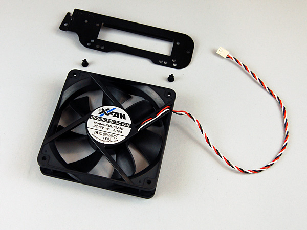 ファンの回転数はHigh(回転数3150rpm/公称騒音レベル32dB),Middle(同2400rpm/28dB),Low(同1550rpm/24dB)の3段階に変更可能。また,スペースの限られたPC用として,クロスフローファンの代わりに120/90/80mm各ファンを装着可能にする金具も付属する(右下,ファンは別売)。ただし,ファンを金具に固定するための付属ネジはかなり使いづらい。ネジは別途用意するほうが賢明だろう。