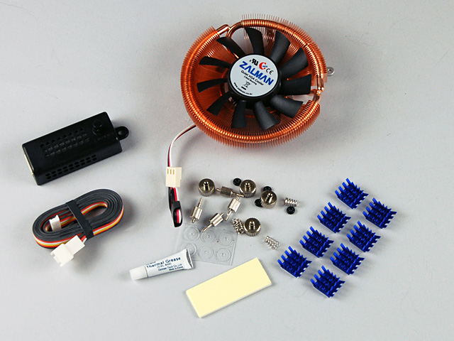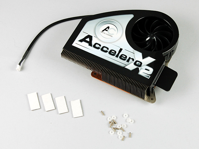 GPUに接する銅ベースから,2本のヒートパイプがファンを囲むように伸びている形状が特徴のVF900-Cu(左上)。ファンの回転数は付属のコントローラにより1350rpm(公称騒音レベル18.5dB)から2400rpm(同25.0dB)まで調節できる(右上)。取り付けが非常に容易になっており,作業は,銅ベースから伸びる4本のアームそれぞれに,スペーサーをかませつつ,カード裏からネジ留めするだけだ。なお,グラフィックスメモリの冷却はヒートシンクを利用することになるが,GPUクーラー本体のフィン構造上,ヒートシンクに対しても風はまんべんなく送られることになる。