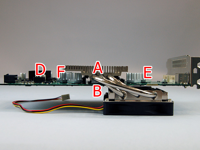V1 ULTRAはそもそもエアフローがないのでは? と思う人もいるだろうが,構造上,ちょうど(E)地点のメモリの真裏にファンが用意されることになるため,結構冷えていたりするのは興味深い。