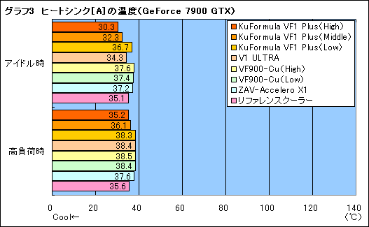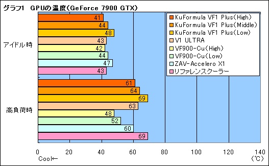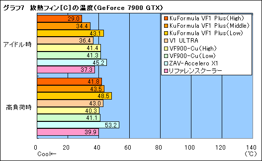 ここで注意したいのは,「フィンの温度が高い=冷却能力が低い」ではないこと。もちろん,GeForce 7900 GTXにおけるKuFormula VF1 Plusの結果をもとに,冷却能力を語ることはできるが,GPU部の熱を,フィンにうまく伝えられているという部分もあるので,単独でこのグラフを評価すべきではない。このスコアは,参考程度に捉えるべきだろう。