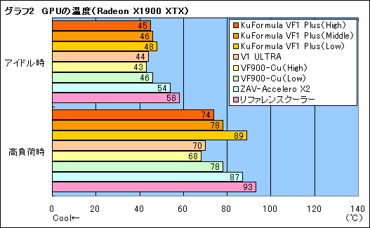 ポイントごと,GPUごとに見ていくことにしよう。まずグラフ1,2は,ドライバの機能で計測したGPUの温度である。今回試用した製品はすべて,冷却能力でGeForce 7900 GTXあるいはRadeon X1900 XTXのリテールクーラーを下回っていないのが分かる。なかでもVF900-Cuは,GeForce 7900 GTXを最低回転数(Low)でも高負荷時に52℃まで抑え込んでおり,これは優秀といっていい。