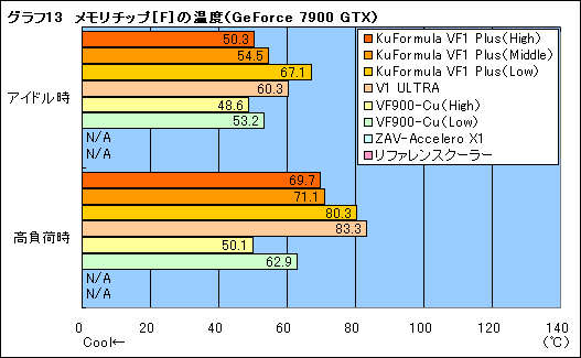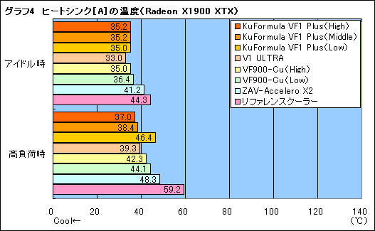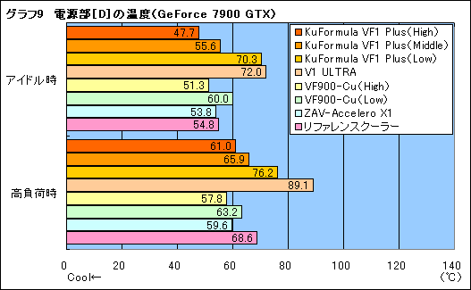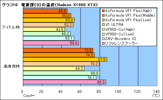 グラフ10でも傾向は同じ。エアフローのないV1 ULTRAよりも,KuFormula VF1 PlusのLow設定のほうが温度が高い理由は断定できないが,V1 ULTRAの構造上,カード裏面全体に風が送られるようになっていることから説明が可能かもしれない。レギュレータ部が密集しているGeForce 7900 GTよりも,ある程度広がって配置されているRadeon X1900 XTXのほうが,有利だったということはありそうだ(もちろん,測定誤差が大きく出た可能性もある)。