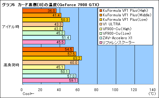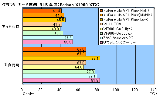 GPUの真裏部分(B)を測定した結果をまとめているグラフ5,6は,基本的にグラフ1,2と同じ傾向を示している。そのため,VF900-Cuの温度が低い。とくにGeForce 7900 GTXの高負荷時において,Low設定でも50.1℃というのはかなり優秀だ。ただし,同じ条件でも,GPU側の発熱がより大きいRadeon X1900 XTXでは,冷却能力が足りないのか,温度は77℃まで上がってしまった。Radeon X1900 XTXで運用するには,回転数をある程度High寄りにする必要があるかもしれない。
