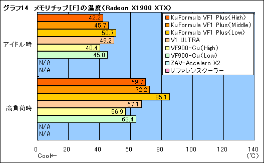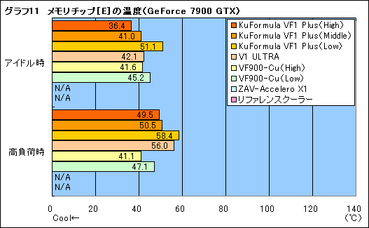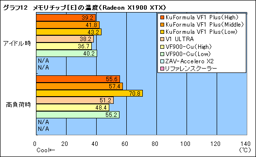 最後に,グラフィックスメモリチップ2点の温度を順に見ていくが,その前に一つお断りを。ZAV-Accelero X1/X2およびリファレンスクーラーは,クーラー本体がメモリチップを覆う構造になり,今回の条件では温度を測定できない。そのため,スコアはN/Aとなるので,注意してほしい。