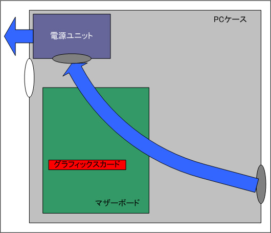 | 左は計測のイメージ。分かりやすいよう,ここでは電源ユニットなどを取り外している。実際の測定環境は右の図を参考にしてほしいが,ケース前面の120mm角ファン(回転数1200rpm)で吸気された風が,底面120mm角ファン×1(自動変速)という仕様のSkyHawk製の定格600W電源「GM-600WP-R」から排気されるという,一方通行的な配置とした。ケース背面ファンは用意していないので,一般的なPCケースよりはやや厳しい温度環境になる。簡単な模式図を右に示したので,参考にしてほしい。図中,灰色の楕円はファン,青い矢印はエアフローを示している。 |