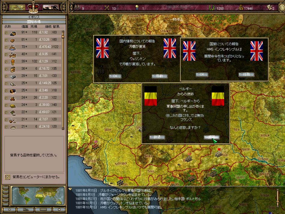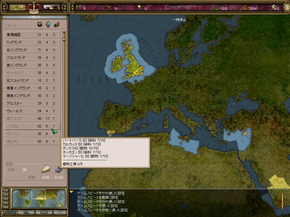 | イギリスを経営中。本国は無論のこと,インド,カナダ,アフリカの各地,中国南部を管理する。パニック必至だ |