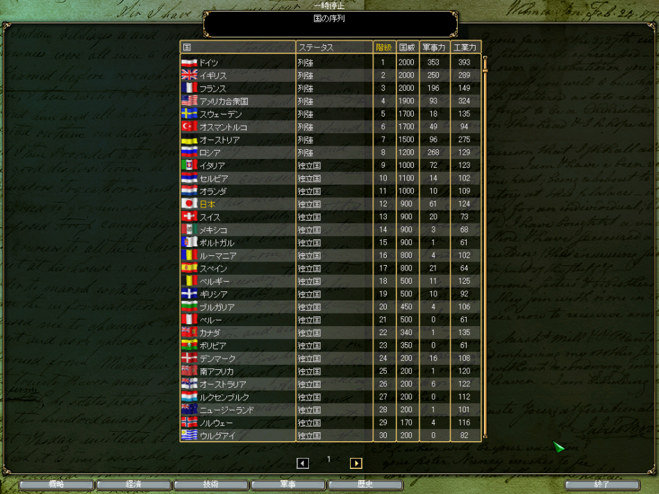 数多くの要素をいじれるゲームだけに,実現できる歴史ifの範囲もまた広い。史実でうまくいかなかった国を選択し,史実をはるかにしのぐ成果を上げることもそれほど難しくないし,逆に史実ではうまくいった国の豊かさを利して,ありえない政治体制を敷いてみたり,いささか気の早い第一次世界大戦の原因になってみたりするのも面白い。