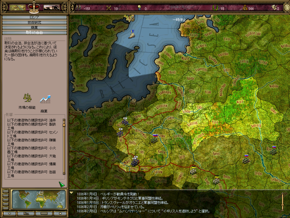 国内で何が生産できるかは,その国家の技術水準にも依存する。技術の発展度合いは国の教育水準に影響を受け,それはそのまま国家予算の配分と連動する。そのうえで,国内生産では足りないものを海外から輸入しなくてはならないのだが,輸入ラインが不安定なのがミソで,しばしば供給が途絶える。安定した供給を確保したいなら,当該産品の算出地域を自国の領土/植民地にするしかないわけで,このあたりがビクトリア朝/パックス=ブリタニカ期の植民地競争を大局的な見地からシミュレートするゲームとしての骨格を形作っている。