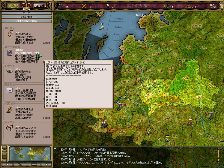 もう一つ重要なファクターとなるのが「人口」だ。どんなに技術を発展させ,汽車を中心とした効率の良い交通網を作り上げても,工場で働く労働者が確保できなくては意味がない。さりとて一足飛びに農業人口を労働者人口にシフトさせると,ウクライナやアイルランドもかくやという大飢饉に見舞われたりもする。また,政治体制として最低賃金が保証されていなかったり,最大労働時間が長すぎたりすると,国内人口は少しずつ,より暮らしやすい国に流出していく。