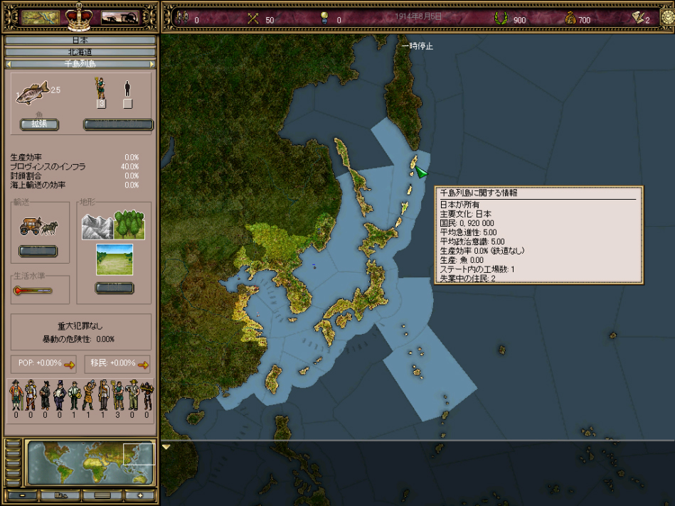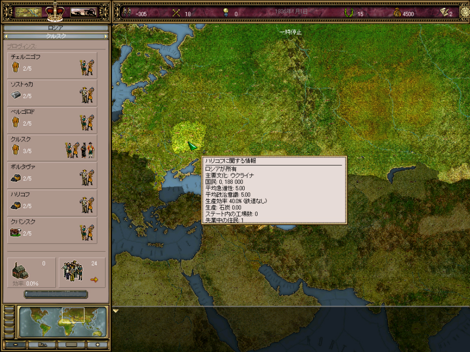 Paradox Entertainment作品の常として,データはかなり詳細。このような人口分布のデータも,当然ながら全世界に渡って存在する |