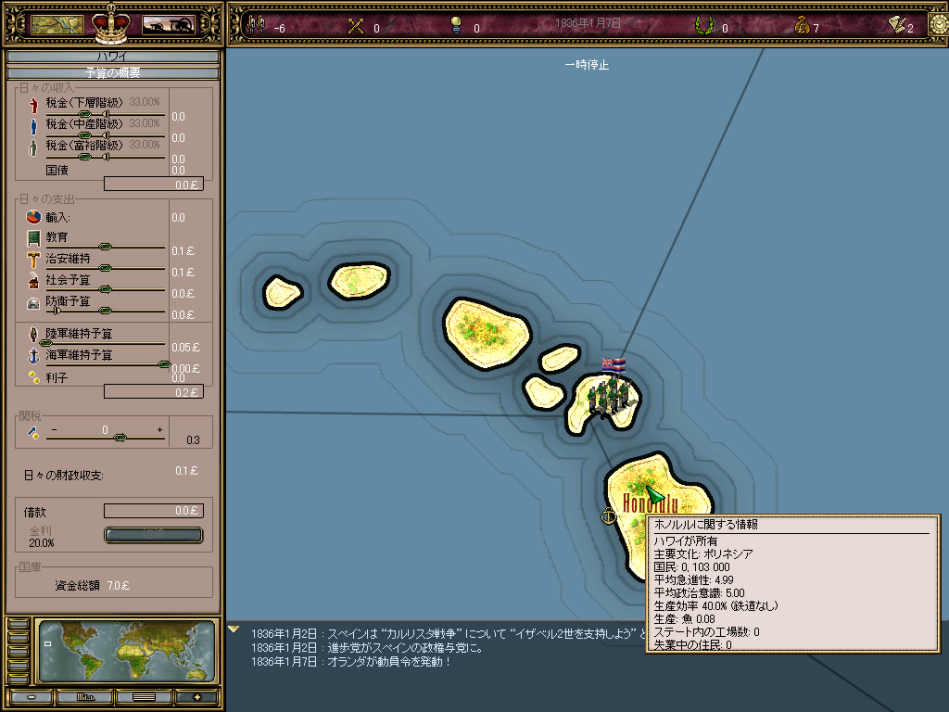 ハワイでスタート。収支はかろうじてプラスながら,+0.1で残高7ポンド。やってやれなくはないものの…… |