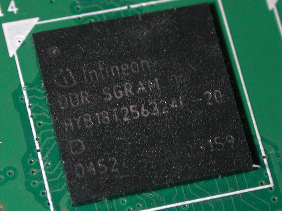 | 左上:チップクーラーを取り払ったカード表面 右上:カード裏面。メモリチップ用の空きパターンは用意されていない 左下:搭載するメモリチップはInfineon Technologies製の2ns品だった。1GHz駆動なので,チップのスペックどおりに動作しているわけだ 右下:AOpen製の7800GTX搭載グラフィックスカード「Aeolus PCX7800GTX-DVD256」と長さを比較してみた。若干コンパクト |