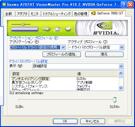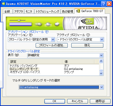 さて,もう一つNVIDIA SLIにちなんだ話を。意外と知られていないが,NVIDIAはRelease 75世代の最新ドライバであるForceWare 77.77で,「SLI antialiasing」(以下SLI AA)という機能を追加した。これは端的にいうと,NVIDIA SLI動作時に限り,16倍(16x)のAAを有効化するという機能。身も蓋もない言い方をするなら,ATI Technologies(以下ATI)が"ATI版SLI"「CrossFire」で実現しようとしている14x AA機能「Super AA」対抗の機能だ。7800GTXでも利用できるので,7800GT固有の機能というわけではないが,ここでチェックしてみることにしたい。