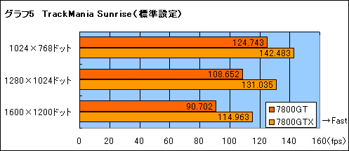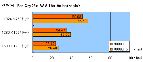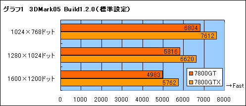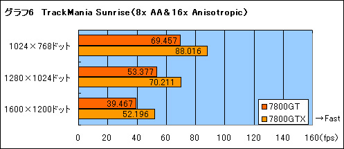 結果はグラフ1〜6のとおり。結論からいえば,7800GTと7800GTXでは,7800GTXのほうが12〜20%程度高速だ。コアクロック(約8%),メモリクロック(20%),ピクセルパイプライン(20%)という3要素がスコアの差を生んでいるのは間違いない。一方で,高解像度環境や高度なフィルタリング適用時といった高い負荷のかかった状況下でも,7800GTと7800GTXとの差が常に一定という点は興味深いところである。