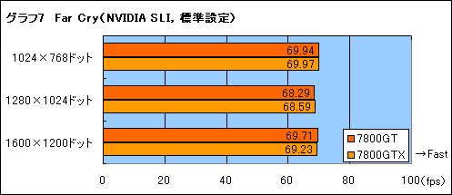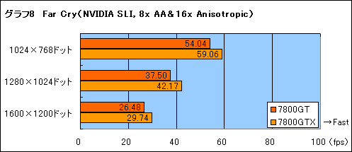 時間の都合でFar Cryのみとなるが,NVIDIA SLI接続時のパフォーマンスもチェックしておこう。スコアはグラフ7,8にまとめたが,シングルグラフィックスカードでテストしたグラフ3でもCPUがボトルネックだっただけあって,標準設定時のスコアは解像度を上げてもまったく変わらない。それに対して,高負荷のフィルタリングを適用したグラフ8では,スコアの差は9%程度となり,7800GTと7800GTXの差が詰まるのが分かるだろう。