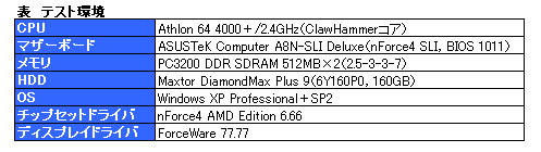 さて,前振りはここまでにして,さっそくベンチマークテストを行っていきたい。PX7800GTの付属ドライバCD-ROMには「ForceWare 77.76」が付属していたが,NVIDIAが2005年8月11日中に公開予定の「ForceWare 77.77」を事前に入手できたので,今回はこちらを利用することにした。そのほかのテスト環境は表のとおり。機材調達の都合上,Athlon 64のコアはClawHammerである。この点は頭に入れておいてほしい。