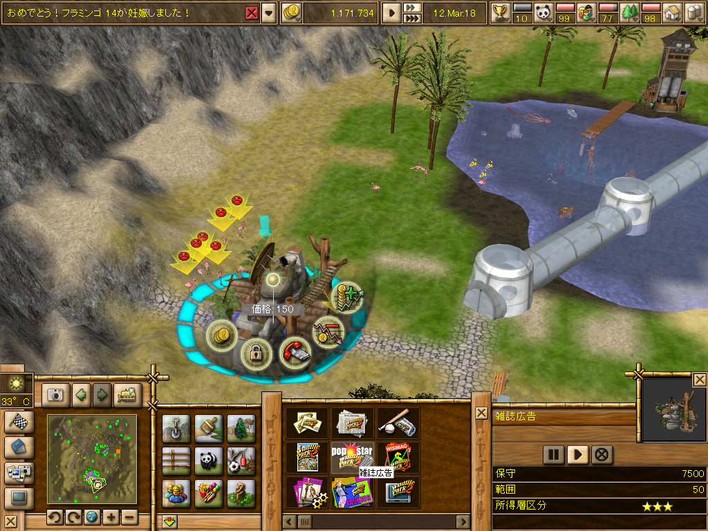 動物達が快適に暮らし,繁殖がスムースに行われるようになってきたら,さらに経営に力を入れる絶好のタイミングだ。動物園の入場ゲートをクリックすると四つのアイコンが表示される。このうち「マーケティングパネル」を選ぶと,動物園の広告/宣伝方法を選択できる。宣伝には安価な「パンフレット」「ポスター」のほか,「経済雑誌」「地域のテレビ番組」などの種類があり,それぞれ費用と範囲,対象となる所得階層が異なっている。