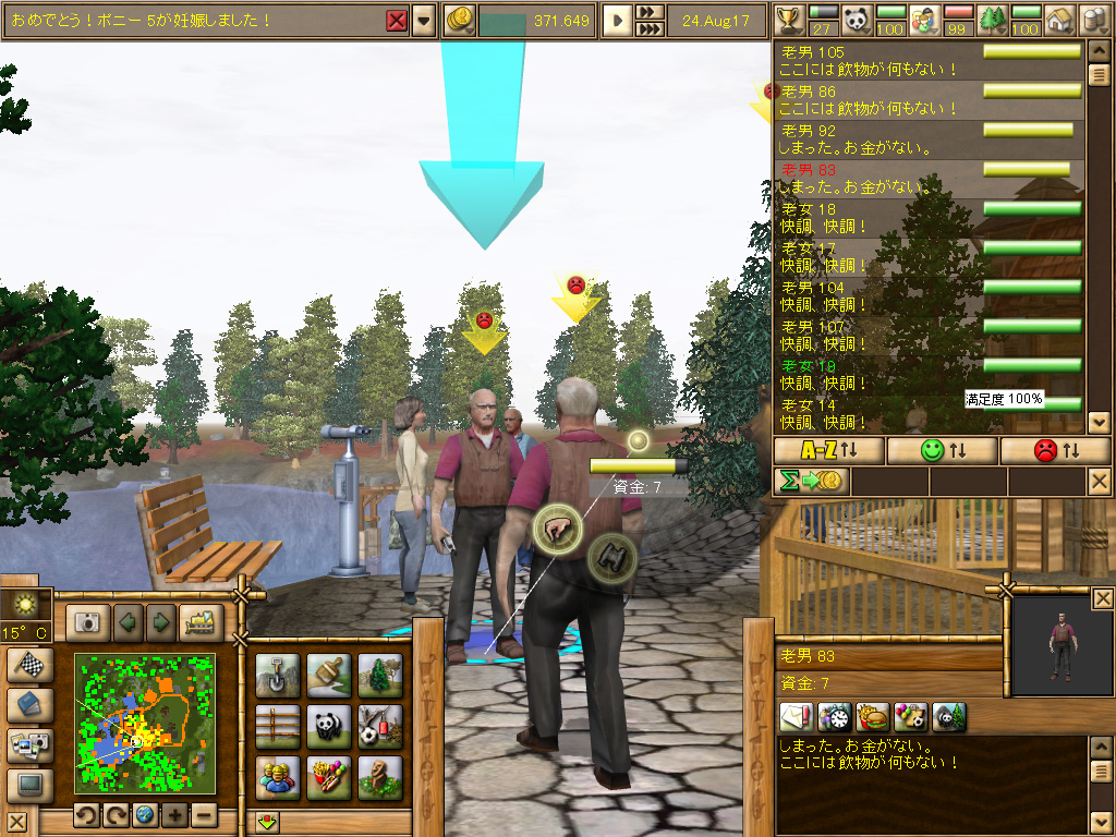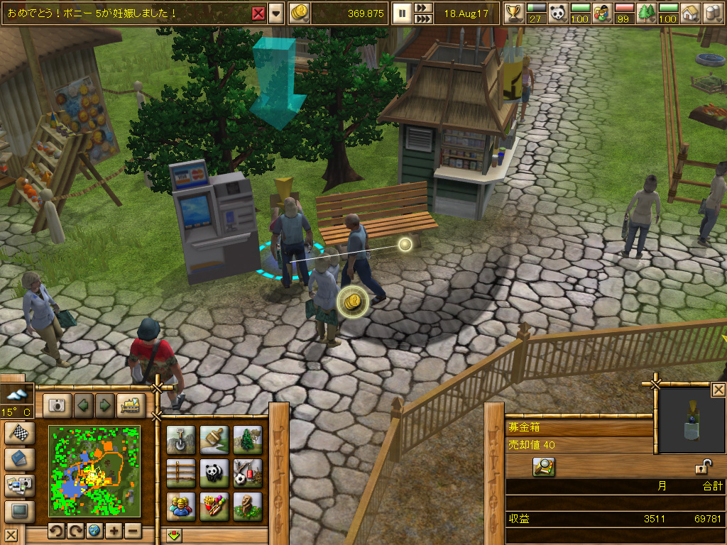 こうして集客に成功したら,あとは園内での来園者の満足度を高めていくだけだ。道が平坦すぎても,植物やオブジェクトが足りなくても,お客様はすぐに不満を抱く,なかなかのワガママっぷりだ。園内のルートに高低差をつけたり展望台を置いたりと,飽きさせない工夫が必要になる。慣れないうちは,どうしても動物を優先した設計をしがちなため,あとからベンチや自動販売機を設置しようと思っても余分なスペースがないことも多い。失敗を重ねるうちに「このあたりで飲み物屋を1軒,これぐらいの間隔で眺めの良い高台を置こう」といったカンが身についてくる。そこまでマスターすれば,夢の動物園作りに取り掛かれる日は近い。
