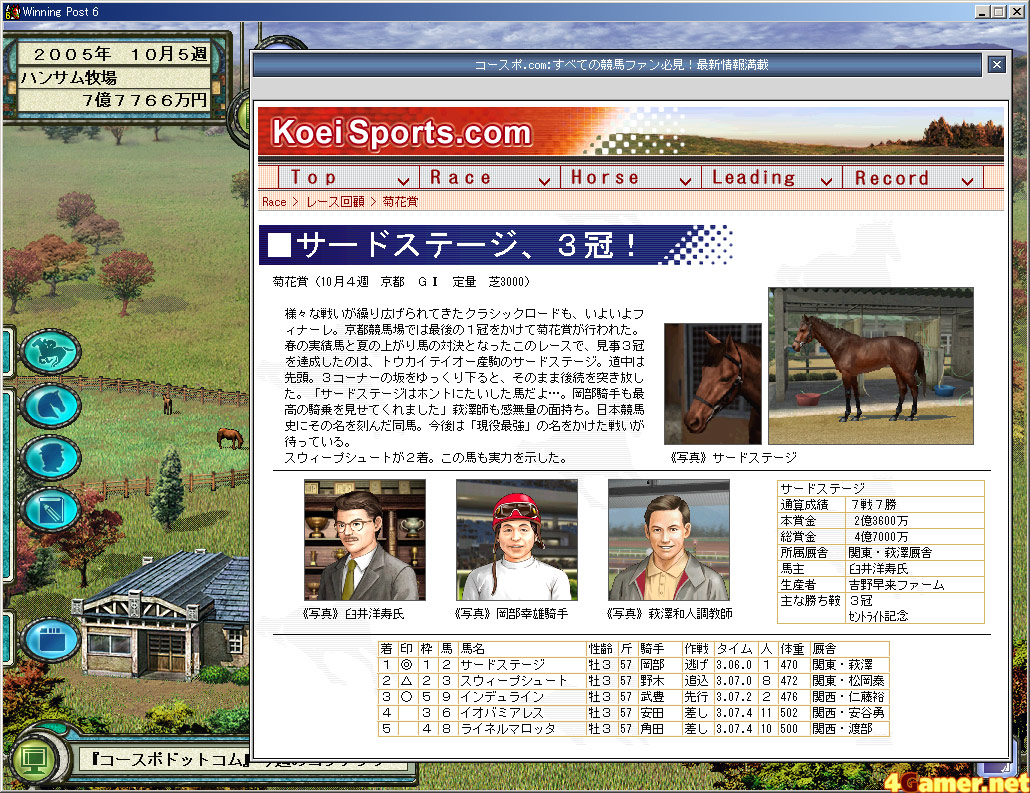 毎週「Winning Post6」内で行なった競馬ニュースを伝えてくれる,「コースポドットコム」も健在。ゲームとは思えない緻密な記事のほか,レコードブックや各種ランキング情報などもまとめてチェックできる。競馬に詳しくないプレイヤーのために,大レースに向かう定番ローテーションなども紹介されている。別ステップを選んだライバルのレースぶりなども,ここで確認しておくのがベスト。