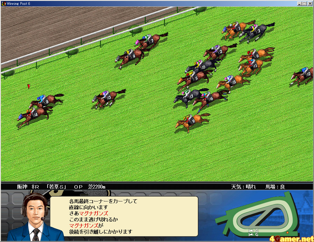 4コーナーでの攻防がますます派手に。カーブに曲がるカメラワークから,馬群が直線入り口に差しかかるとこのアングルに移行。もし差し・追い込み馬の前が壁になっていたら,直線に入ってからの苦戦は必至だ。騎手のポジション取りにも着目して,何度も同じミスを繰り返す騎手は乗り替わりも考えよう。将来のために若手騎手を育てるのも大切だが,今腕のいい騎手にはどうしても惹かれてしまう