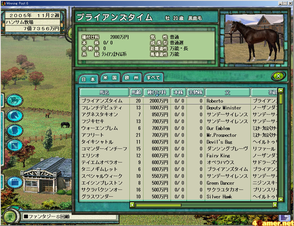 チャンピオンサイアーだったサンデーサイレンスはもういない。今までナンバー2に甘んじて来たブライアンズタイムが次の天下を取るのか,サンデーの息仔や孫が父の跡を継ぐのか,それとも現実に"ポスト"サンデーサイレンスとして輸入されたウォーエンブレムなどが期待に応えるのか。プレイ状況にもよるが,リーディングサイアー争いはかつてないほど激しいものとなる