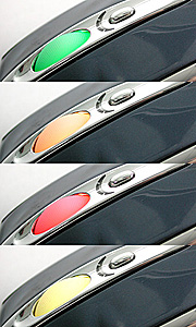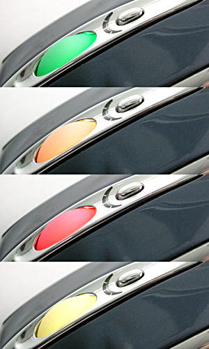 | ホイール脇の解像度変更ボタンをで解像度を切り替えると,ホイール部のLEDも切り替わり,現在どの解像度に設定されているか分かるようになっている。色は600dpiが無色,800dpiが緑,1200dpiがオレンジ,1600dpiが赤,2000dpiが黄と赤の交互点灯にそれぞれ対応する |