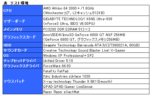 以上を踏まえて,検証していくことにしよう。テスト環境は表のとおりで,今回もマウスパッドは5製品用意している。