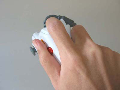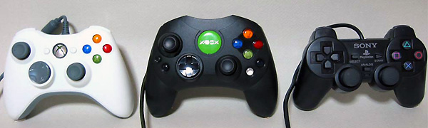 | 左から順にXbox 360パッド,初代Xbox用コントローラ,デュアルショック2を握ったところ | ||