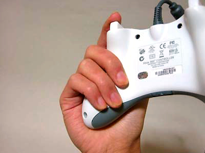 このほか,少々気になったのは,デュアルショック2をしばらく使ってから改めてXbox 360パッドを握ったときに感じた,グリップ部にある多少の違和感である。思い起こせば,これは初代Xbox用コントローラでも気になっていた部分で,違和感の正体はトリガーの出っ張りだ。デュアルショック2にない,この出っ張りのために,左のアナログスティックと右にある4ボタンの押下を背面から支える指がなくなるのである。気にしなければ気にならないかもしれないが,デュアルショック2と比べて中指の収まりが悪いと訴えるプレイヤーも出てくると思う。