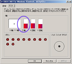 アナログトリガーの扱いは,Z軸(丸く囲んだ部分)のプラスマイナスで制御される。トリガーの開放と同時押しがプラスマイナスゼロと同じ扱いになってしまう点が致命的。ドライバレベルで解消できる問題なので,今後のアップデートに期待したい |