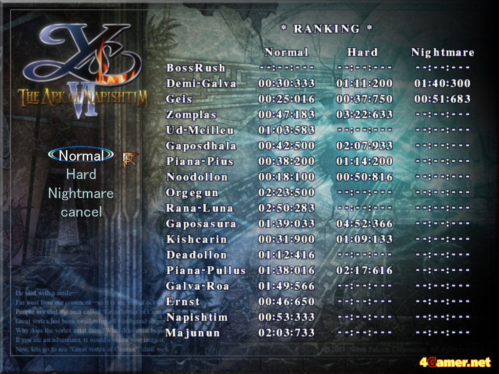 だが,前述したように「通常版」の単体作品としての価値は,決して低いものではない。すでに「イースVI」を所持しているユーザーでも,より手応えのある高難度モードや,魅力的なタイムアタックモードを楽しんでみたいと思うのならば,本作の購入を検討してみてもいいのではないだろうか? もっとも,「限定版」を「通常版」相当にするパッチか,タイムアタックモードのみがプレイ可能なパッケージが低価格で販売(あるいはダウンロード販売)されれば,非常に嬉しいのだが……。