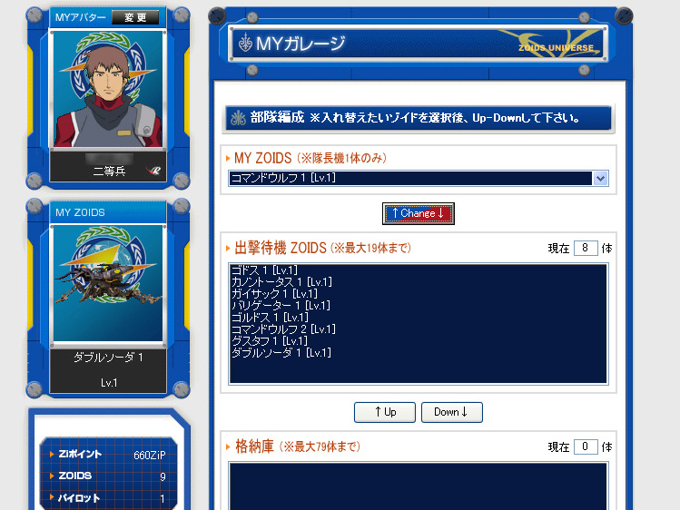 とくに大きく変わったのは「MYガレージ」で,所有しているZOIDSがすべてサムネイル表示され,自分がどんなZOIDSを所有しているのかを一目で把握できるようになったのは嬉しい。