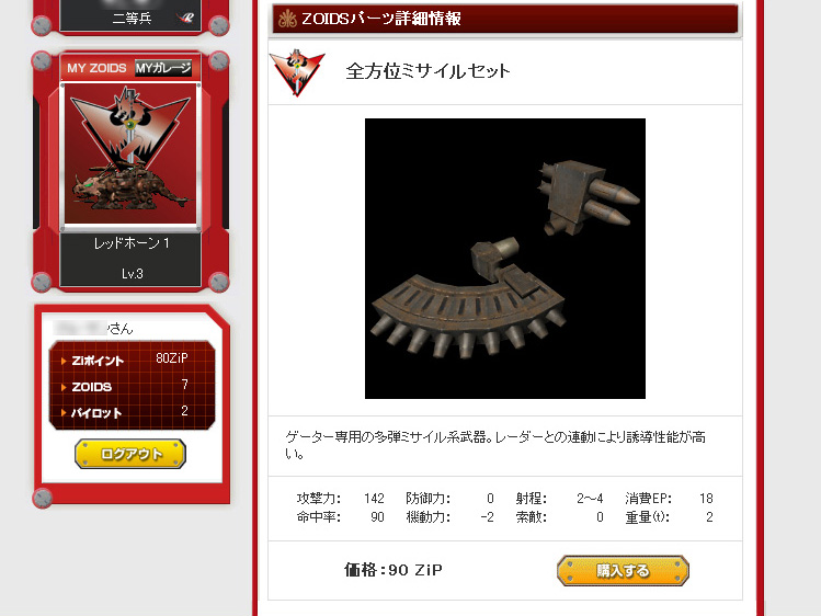 「部隊編成」の項目では,ZOWに参加させるZOIDSやアバターが乗る隊長機の選定などがしやすくなっている。「格納庫」を使うほどZOIDSを買いすぎるプレイヤーはしばらくいないだろうが,正式サービスが軌道に乗ったら,こうした機能の重要性も増すだろう。所有しているZOIDS達の詳細データも,基本性能から付けている武装パーツまできちんと表示されるようになったので,カスタマイズのプランも立てやすくなった。以前は換装パーツの確認にかなり手間取っていたので,これは大きな進歩である。